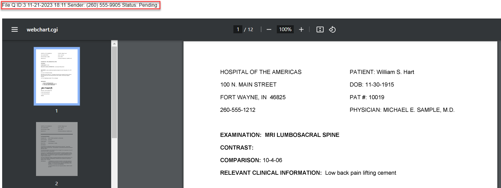 1. In the new window, at the top of the screen, summary information displays. The summary includes the File ID, Date and Time it was created in the queue, the Sender’s fax number, and the status.