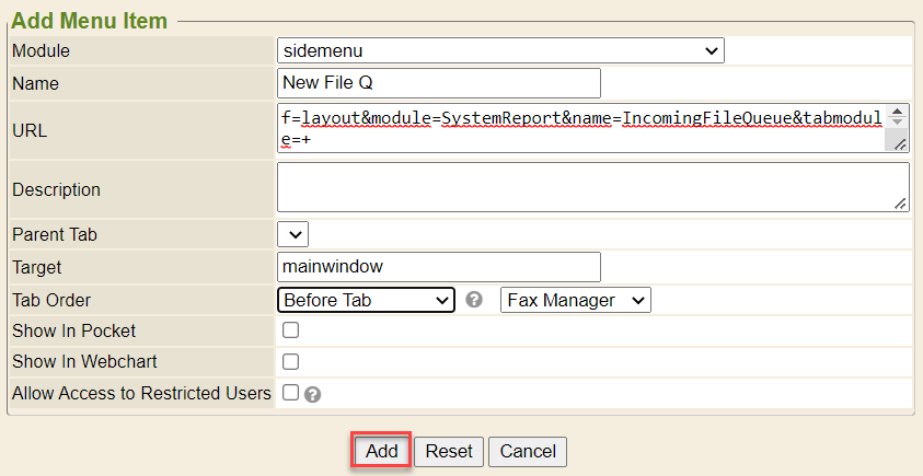 1. Add the URL - ?f=layout&module=SystemReport&name=IncomingFileQueue&tabmodule=+