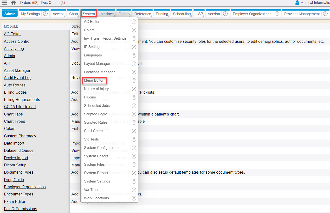 1. From the Control Panel on the left side menu, click on the System chart tab and then click on the Menu Editor sub-tab