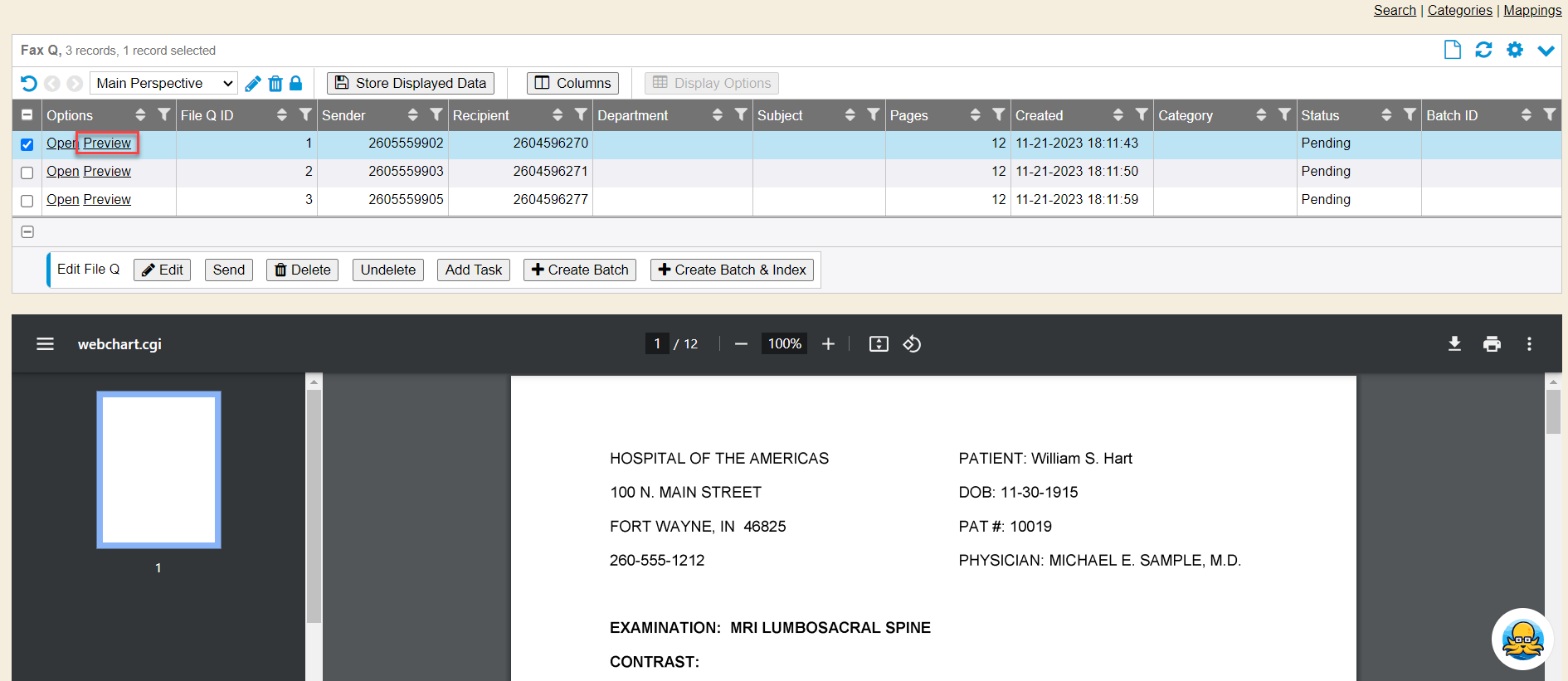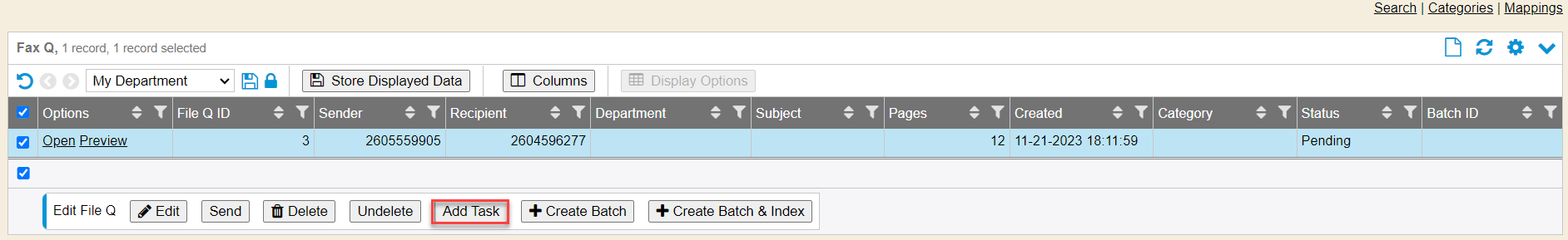 The File/Fax Queue allows for viewing/indexing of incoming faxes. Within the module, a file can be previewed or opened, tasks generated, file sent to a new user or department, or indexed directly within the queue or WebScan. This module has recently been updated to now include additional information when opening the file. When a user opens the file, they will see a summary of that document. The summary includes the File ID, Date and Time it was created in the queue, the Sender’s fax number, and the status. When a user hovers over this information, a set of shortcut icons are displayed. The icons will be reviewed in the Documentation section. The File/Fax Queue is a feature that can be added or upgraded for an additional cost.